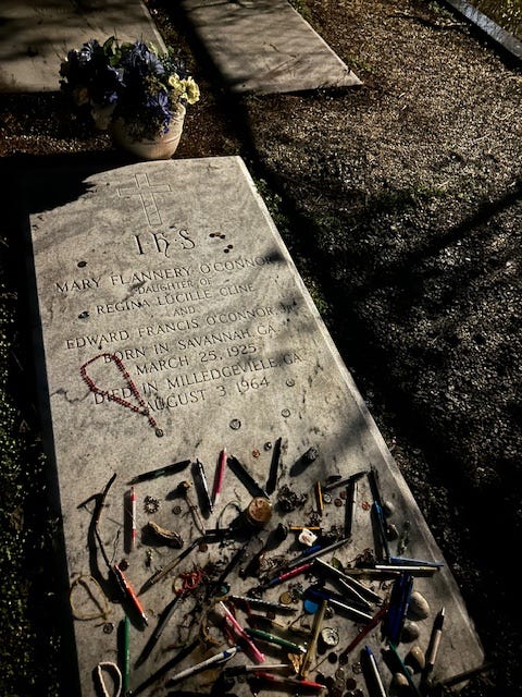 Natalie came down from Atlanta to join me at the book fair that Saturday. We rented a little treehouse cabin on the outskirts of town and extended our pilgrimage. I had planned for this piece I’m writing now to be about the fine time we had there—a kind of jovial travel blog about how you don’t have to go far to have fun if you’re in the right company. I was going to write in detail about how we visited Flannery’s grave in the cold, dark rain, and smoked a cigarette as we rearranged the pens that adoring fans had seemingly dumped on her gravestone. I was going to write about our adventures downtown. The dark coffee house. The grungy pool room. The singer in a mechanic's shirt who had delivered disappointing Tom Petty choruses. You’ve got to put more ass into it, man! The guitar player who had carried the band.