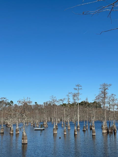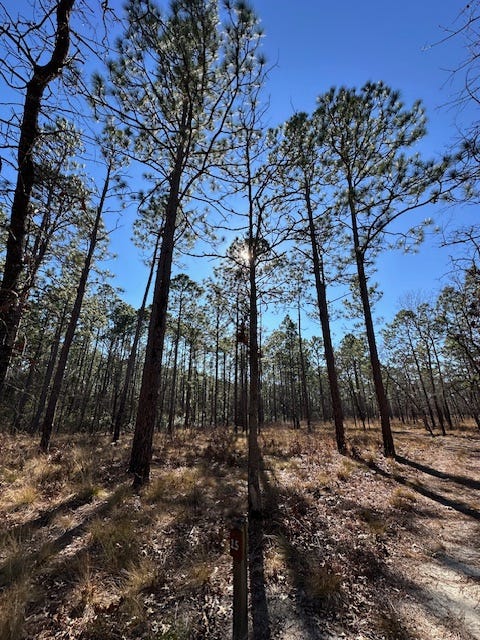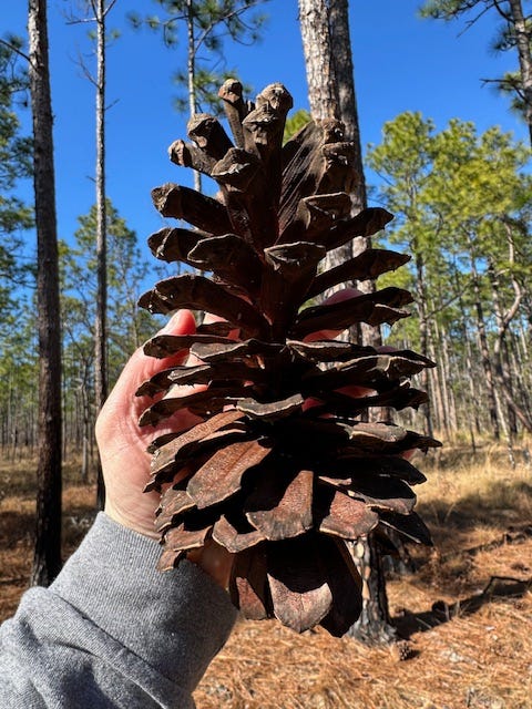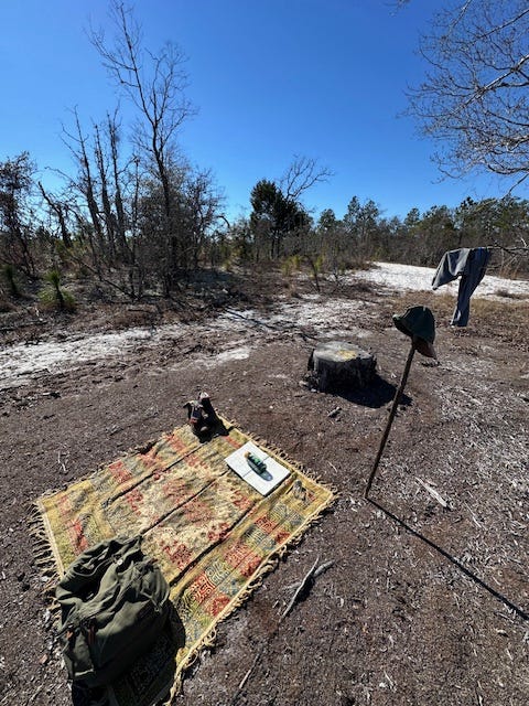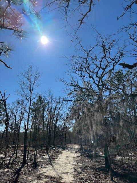 A couple of weekends ago, while visiting family in southeast Georgia, I hit up one of my favorite parks in the area, a state park called George L. Smith, named for a local dead politician. The park is known for its 400-acre cypress pond, which is formed by several creeks and which empties, through an old grist mill and dam built in 1880, into Fifteen-mile Creek, a blackwater stream that flows through my home county. I love paddling through the huge cypress trees there. In the fall, the needles of the cypresses turn bright orange and make for a gorgeous scene. But this time, I was there to hit the footpath. There are over seven miles of hiking in the park but I particularly love the three-mile loop trail north of the lake that winds through a beautiful upper coastal plains sand dune area replete with an iconic longleaf pine-wiregrass-turkey oak ecosystem. This is what southeast Georgia looked like previous to so much of the land being converted to agricultural use. I love to imagine, while taking a stroll there, that I have stepped through a Pre-Columbian time portal. The trail runs through some prime gopher tortoise and indigo snake habitat and some great birding territory. I didn’t spot too much wildlife this day but found a quiet, sunny area near an old dried-up ephemeral pond bed to roll out my little gypsy rug. I meditated and prayed there for some time, giving thanks to God for the freedom to enjoy such a wonderful place and day.