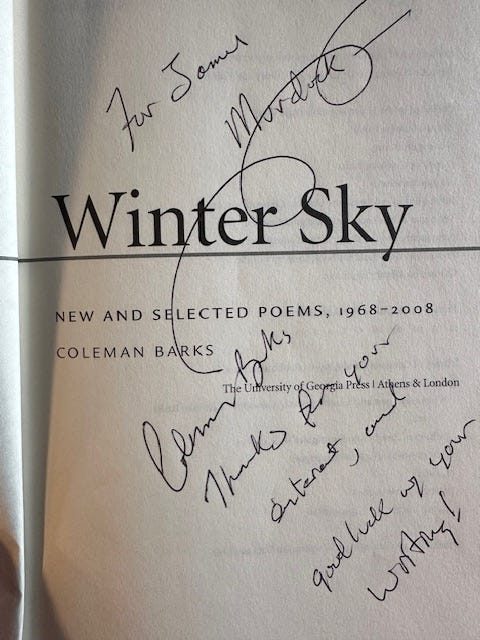 Also, I wanted to take a moment to acknowledge the passing of a legendary literary figure who, for decades, lived in a community close to me. Coleman Barks was the renowned translator of Rumi, the famous 13th Century Persian poet. He was also a brilliant writer and poet in his own right and taught English at the University of Georgia for thirty years. Coleman was known around town as a jolly, light-hearted, Dionysus-type character. He gave beautiful heartfelt readings and wrote narrative poems, often funny, that strike at the complicated heart of humanity.